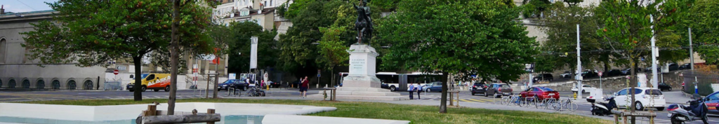 N.B. Dans le prolongement de la place, au pied de la Treille, on peut voir le buste d’Henry Dunant (1828-1910) fondateur de la Croix-Rouge, et du côté opposé la structure en béton inspirée par le Corbusier qui tranche avec l’architecture de la place, et a néanmoins reçu le nom du célèbre cavalier tout proche pour abriter l’Uni Dufour (voir Maison de la Paix).